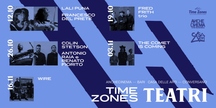 Dal 12 al 26 ottobre - Anche Cinema Torna la 34° edizione di Times Zones che riparte dalla contrapposizione con la musica mainstream e presenta un lavoro minuzioso di ricerca e contaminazione all'insegna della grande musica internazionale. Tre appuntamenti da non perdere: Sabato 12 Ottobre vi aspetta Lali Puna, band seminale dell’indietronica tedesca. Sabato19 ottobre con Fred Frith, artista fondamentale per la storia della musica rock. Sabato 26 Ottobre con Colin Stetson, un sassofonista americano riconosciuto per le sue abilità tecniche e compositive.